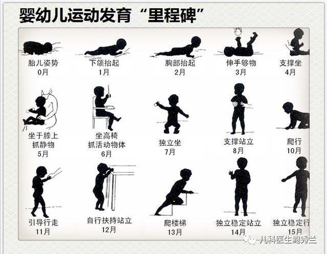 孩子的运动发育,什么时候算迟,什么时候合适?专家称,这里面涉及到运动发育迟缓的概念。运动发育迟缓可以简单理解为:本来宝宝该在这段时间掌握的动作,可是他没有掌握。那宝宝的正常运动发育的过程是怎样的呢?宝宝首先要学会抬头,通常宝宝在3个月的时候,头可以稳定地抬起90度,与床面垂直,胸部也能离开床面;4个月的时候开始会翻身,从仰卧位翻到俯卧位;7个月的时候就可以独坐;8个月开始学习爬行;10个月的时候宝宝可以扶着东西站;1岁可以独立行走。若到了该掌握某项运动能力的时候却没有掌握到,就是运动发育迟缓了。