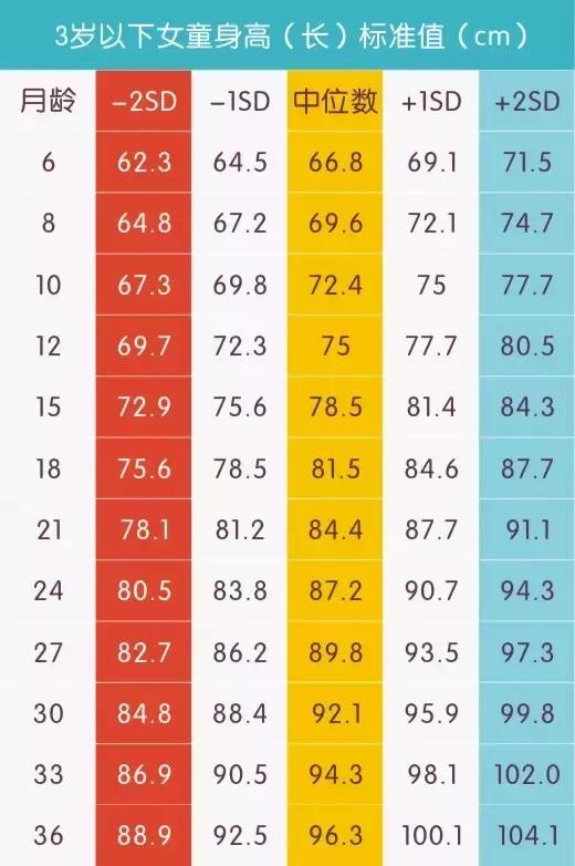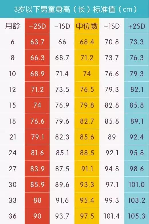 宝妈们可以参考宝宝月龄对应的具体身高值,如果身高值低于左边白色区块(-1sd)的数值,就要注意了。