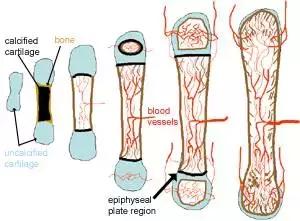 随着各个软骨里骨髓腔的形成,新生儿软骨的血管越来越丰富。人体大部分的骨都不是无中生有,都是先形成软骨,再在软骨的基础上骨化成较硬的骨骼。