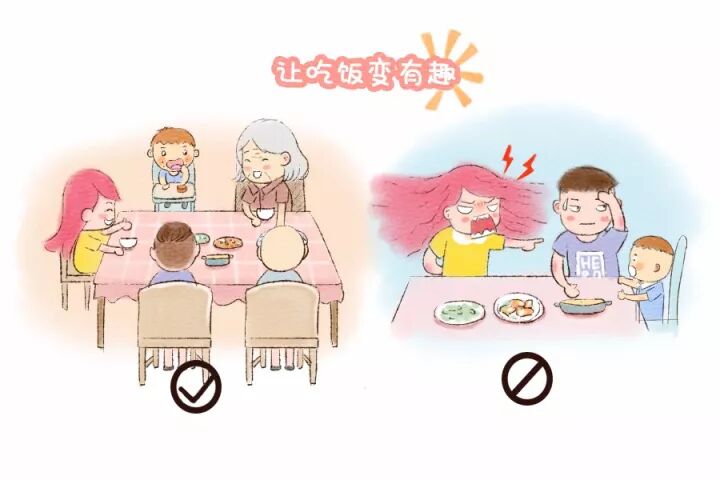 让宝宝觉得吃饭很有趣是很重要的,可以采用游戏的方式诱导他将食物放进你的嘴里,然后做出很美味的反应,接着鼓励宝宝跟你一起吃。吃饭的时间,全家尽量围坐在一起,让宝宝有温馨愉悦的体验,一定不能把情绪带到餐桌上,也一定不要边吃饭边看电视,这点非常重要。