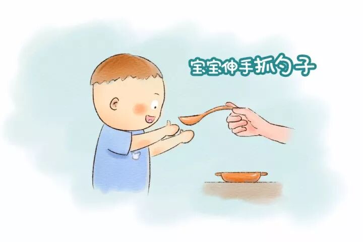 宝宝想自己吃饭的信号:宝宝对大人的食物感兴趣,总是企图伸手去抓你喂给他的食物或者勺子。