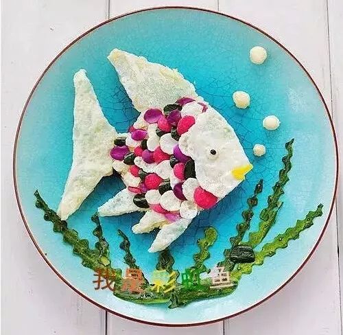 4、叠铺到铺满鱼身,用蛋黄皮剪成鱼的嘴形,花椒籽点缀眼睛。剩下的面包剪些小圆点当气泡,在上面挤上沙拉酱,用黄瓜皮剪出水草装饰。