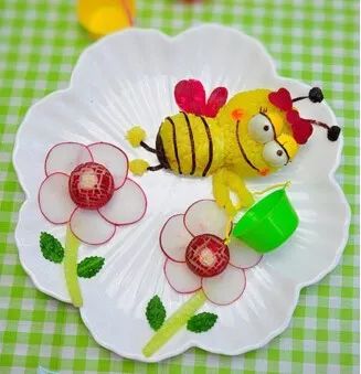 3、樱桃萝卜皮做成翅膀和蝴蝶结。海苔剪出眼睛、嘴巴等。樱桃萝卜吃的时候再浇上沙拉汁即可。