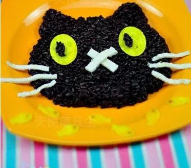 4、在眼睛上再放上少许黑米做眼珠。黑猫下面摆上小鱼即可。