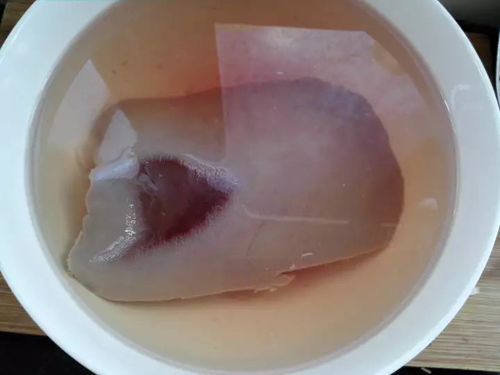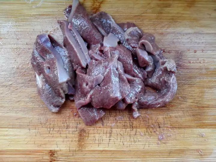4、放入平底不粘锅中翻炒(注:不加油),目的炒干猪肝表面的水分。