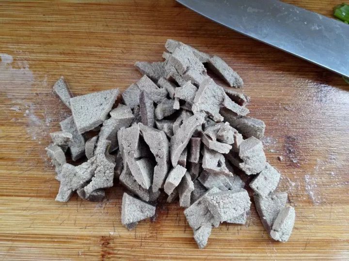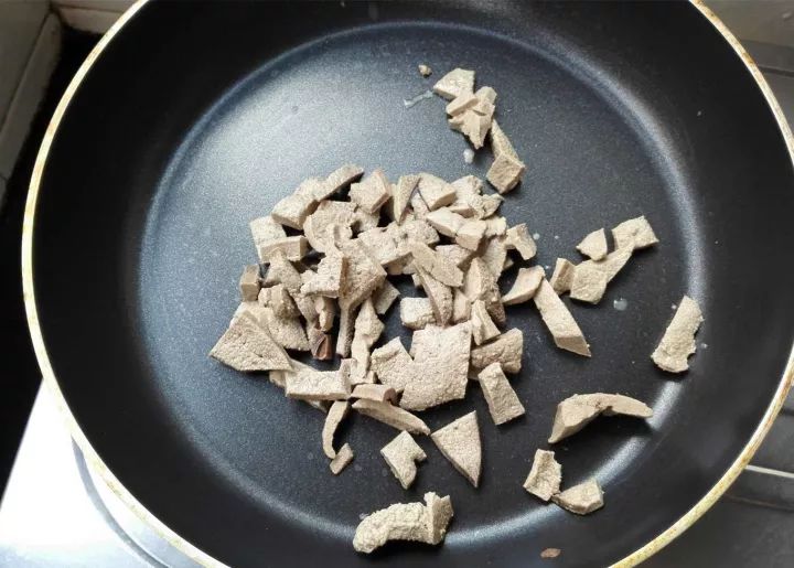 6、将碎块放到平底锅中再次翻炒(注:不加油),目的是再次去除猪肝中多余的水分。