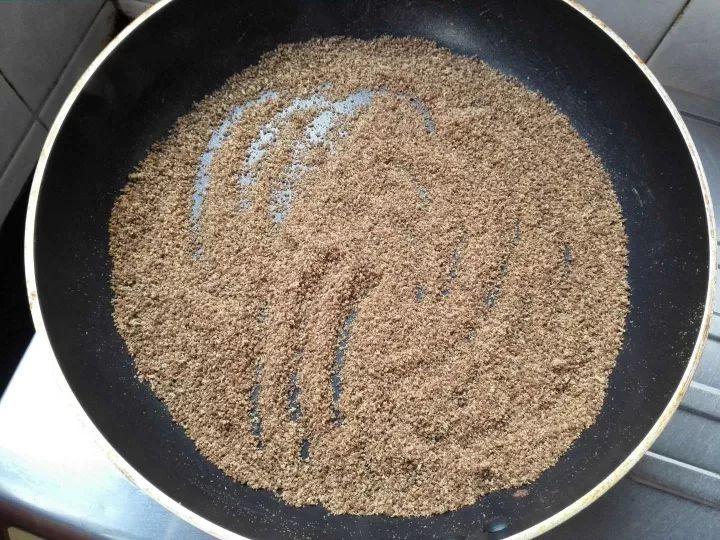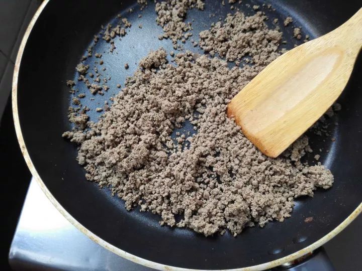 8、将打成粉状的猪肝再次放入平底锅中翻炒,以便彻底烘干。