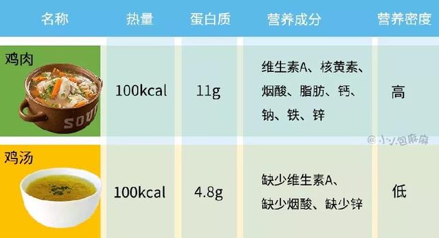 以瓦罐鸡为例,鸡肉每100千卡所提供的营养素既多又高,其中蛋白质就有11g,而鸡汤所含营养素种类少、量也低,蛋白质只有 4.8g,所以,鸡肉比鸡汤营养密度高。