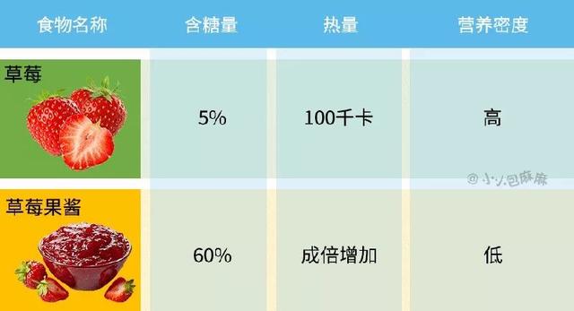 比如说草莓含糖量原本只有5%,如果制作成果酱,增加了60%的糖,热量成倍增加,营养密度就下来了,这还不算维生素等营养素的损失。