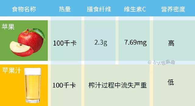 比如说苹果和苹果汁,在热量相同的情况下,苹果能补充孩子身体发育所需的维生素C,还有帮助肠道蠕动的膳食纤维,苹果汁就差远了。