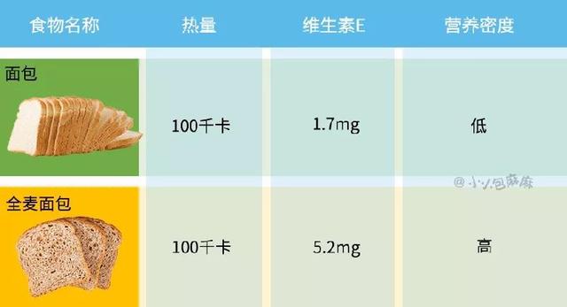 就拿普通面包和全麦面包来说,同等热量情况下,全麦面包所含维生素E是普通面包的3倍。