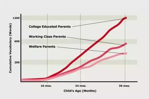 这项研究从孩子9个月开始一直跟踪研究到3岁,记录了这些家庭长达数百个小时大人与孩子的互动情况,结果发现:父母接受过高等教育,来自于较好家庭背景的孩子,平均每小时接收2153个单词量,而来自于靠领取社会救济生活的家庭的孩子,平均每小时只接收616个单词量。