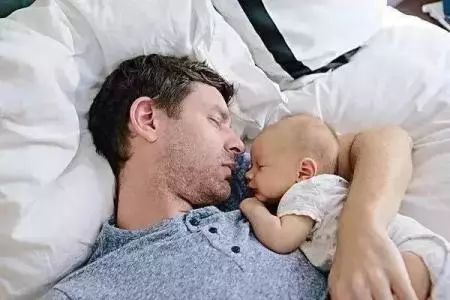 2、你可以通过搂抱安慰或让宝宝俯卧在爸爸的胸腹部,宝宝能睡得更安稳。这样也有利于宝宝长体重。