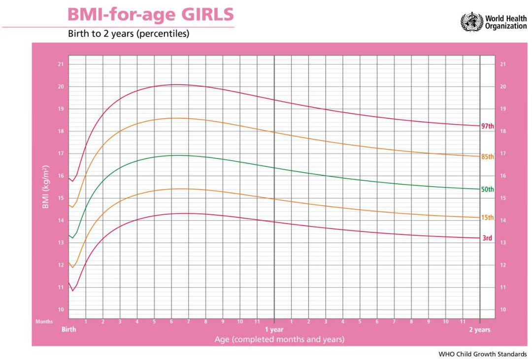 有些宝宝虽然看着有些胖,我们就不能说这个孩子就是肥胖,我们现在根据BMI值(BMI即身体质量指数)来判断宝宝是不是肥胖。体质指数(BMI)=体重(kg)÷身高的平方(m²),比如9个月的女宝宝,体重是8kg,身高70厘米,那她的体重指数就是8÷(0.7×0.7)=16.32,对照下图就是在15~50百分位之间,偏向第50百分位。