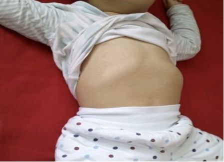 婴儿的膈肌,比较平直,几乎没有弧度。家长还可以发现,当宝宝平躺时,从侧面看宝宝的肋骨处,会明显高于胸廓。这是由于宝宝膈肌尚未发育出生理隆起时,而宝宝胸腹腔内的脏器逐渐发育,就会向外顶出肋骨,这就造成了肋缘出现轻微外翻的现象,这是一种正常的发育过程。如果宝宝瘦,肋缘外翻现象就比较明显。