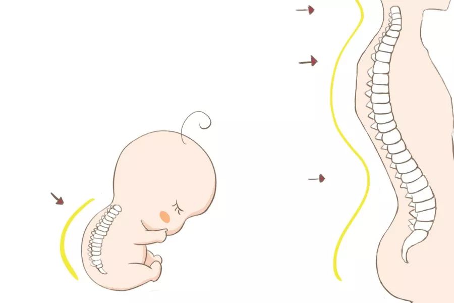 婴儿的颈椎曲度区别于成人,如图所示,新生儿整个脊柱是呈一个大的C型,并没有成人的生理弯曲,这是与宝宝在妈妈子宫内的姿势有关。