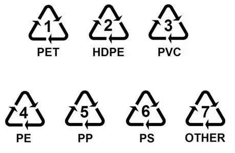 塑料制品回收标识,由美国塑料行业相关机构制定。这套标识将塑料材质辨识码打在容器或包装上,从1号到7号,买塑料制品时,消费者可以通过塑料瓶的瓶底三角回收标志进行辨认。以下是常用的塑料制品的代号: