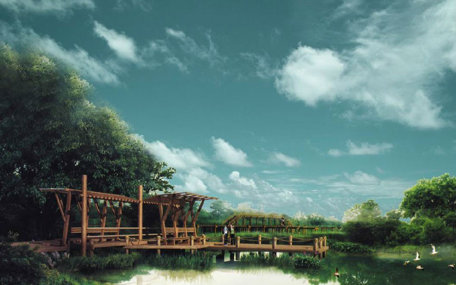 4.1 棚架有分隔空间、连接景点、引导视线的作用,由于棚架顶部由植物覆盖而产生庇护作用,同时减少太阳对人的热幅射。有遮雨功能的棚架,可局部采用玻璃和透光塑料覆盖。适用于棚架的植物多为藤本植物。