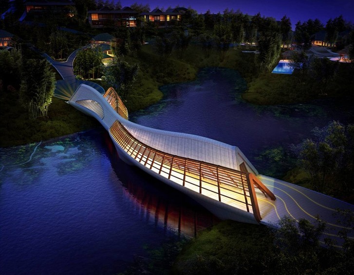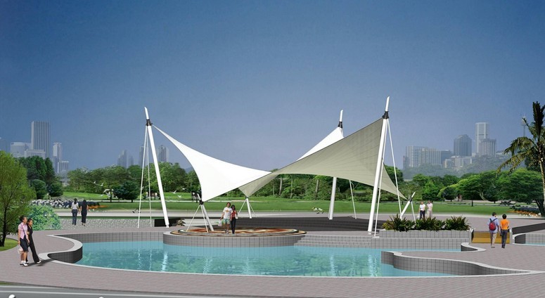 5.3 必须重视膜结构的前景和背景设计。膜结构一般为银白反光色,醒目鲜明,因此要以蓝天、较高的绿树,或颜色偏冷偏暖的建筑物为背景,形成较强烈的对比。前景要留出较开阔的场地,并设计水面,突出其倒影效果。如结合泛光照明可营造出富于想象力的夜景。