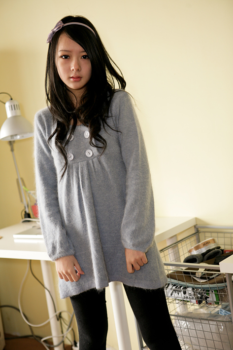 韩版纯色兔毛圆领长袖灯笼袖长款针织毛衣/长款毛衣裙