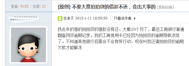 最近小妹在某论坛看到一个帖子《不要大意拍拍贷借款不还,会出大事儿的》。刚看到这个耸人听闻的标题小妹直接傻眼,啥情况!逛个论坛,躺着也中枪?小妹仔细一看,原来是该用户是在抱怨因借款逾期后导致信用卡被冻结的事情。