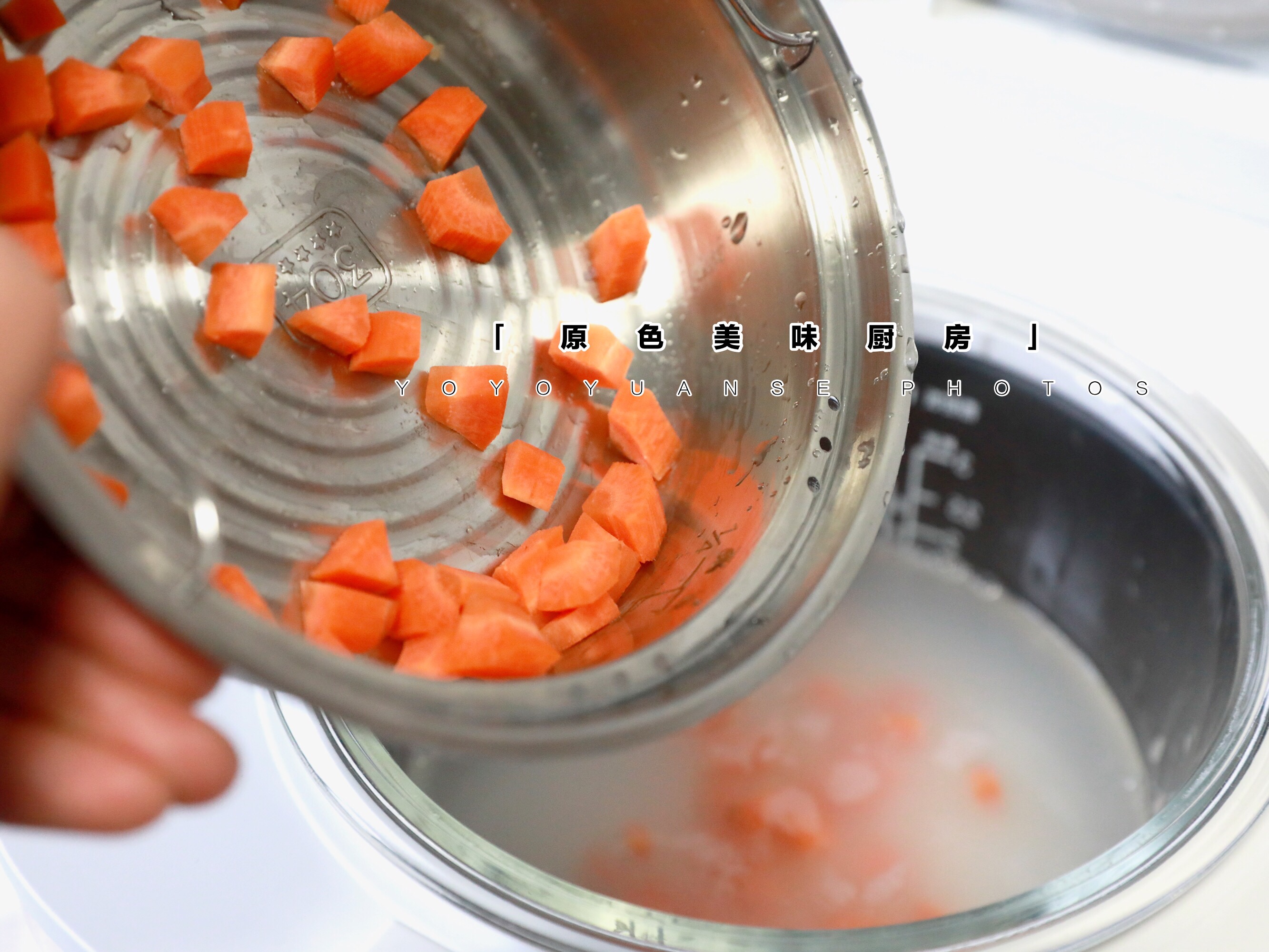 6.大约剩余20分钟时,加入胡萝卜。也可以开始就加入胡萝卜这样煮出来的更软烂,好消化。