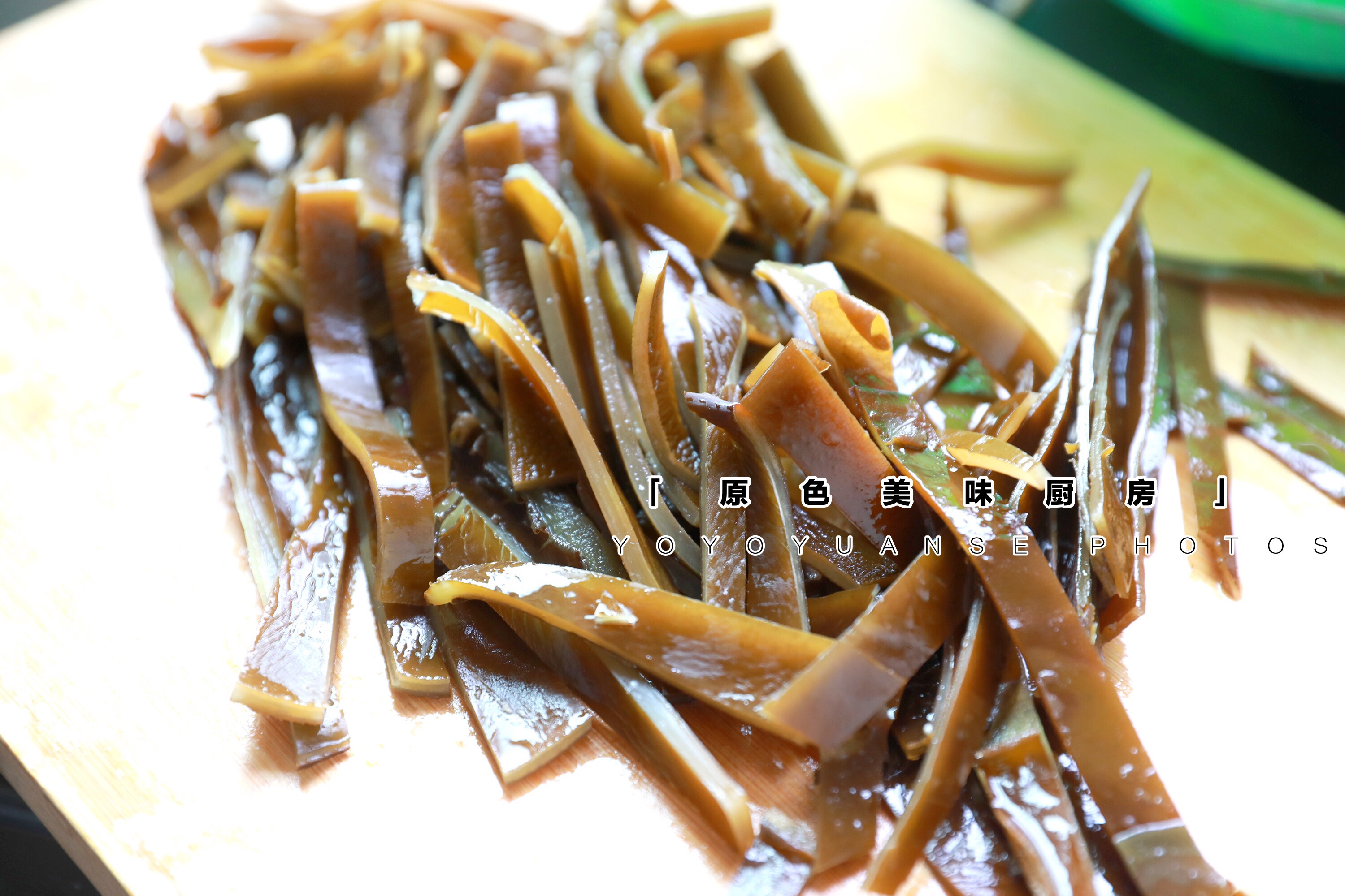 2.将泡软的海带切成细丝。