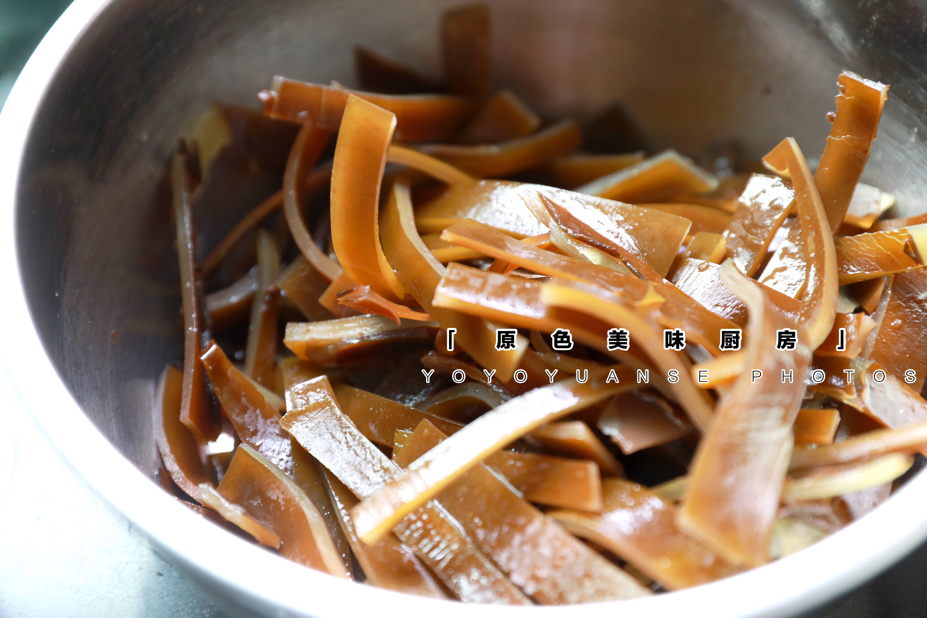 6.海带捞出加入盆内,加入料汁。海带不要过凉水,不然会影响口感。