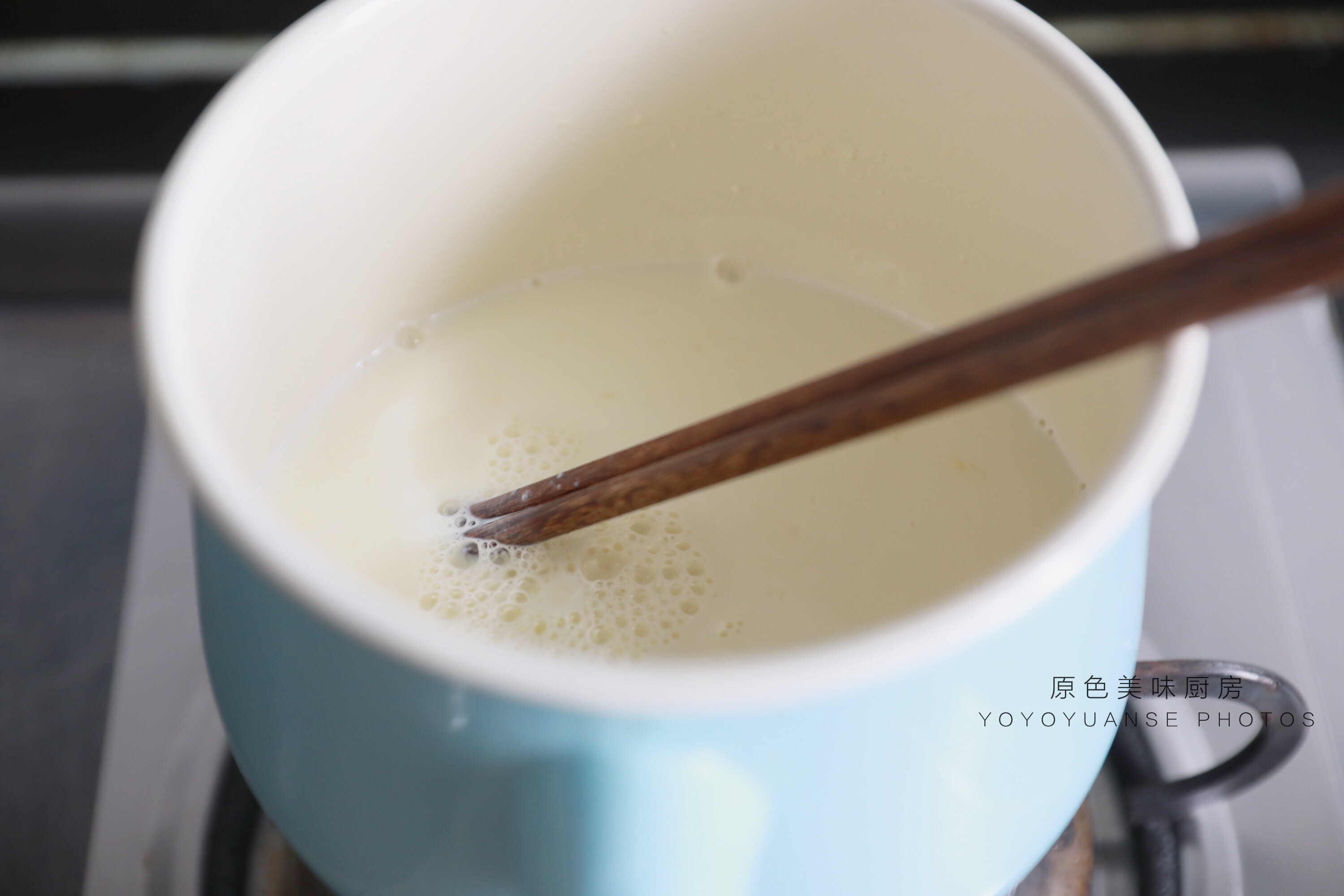 4.将奶锅放入灶台,小火煮,一边煮一边搅拌,不要停止,注意不要糊锅了。