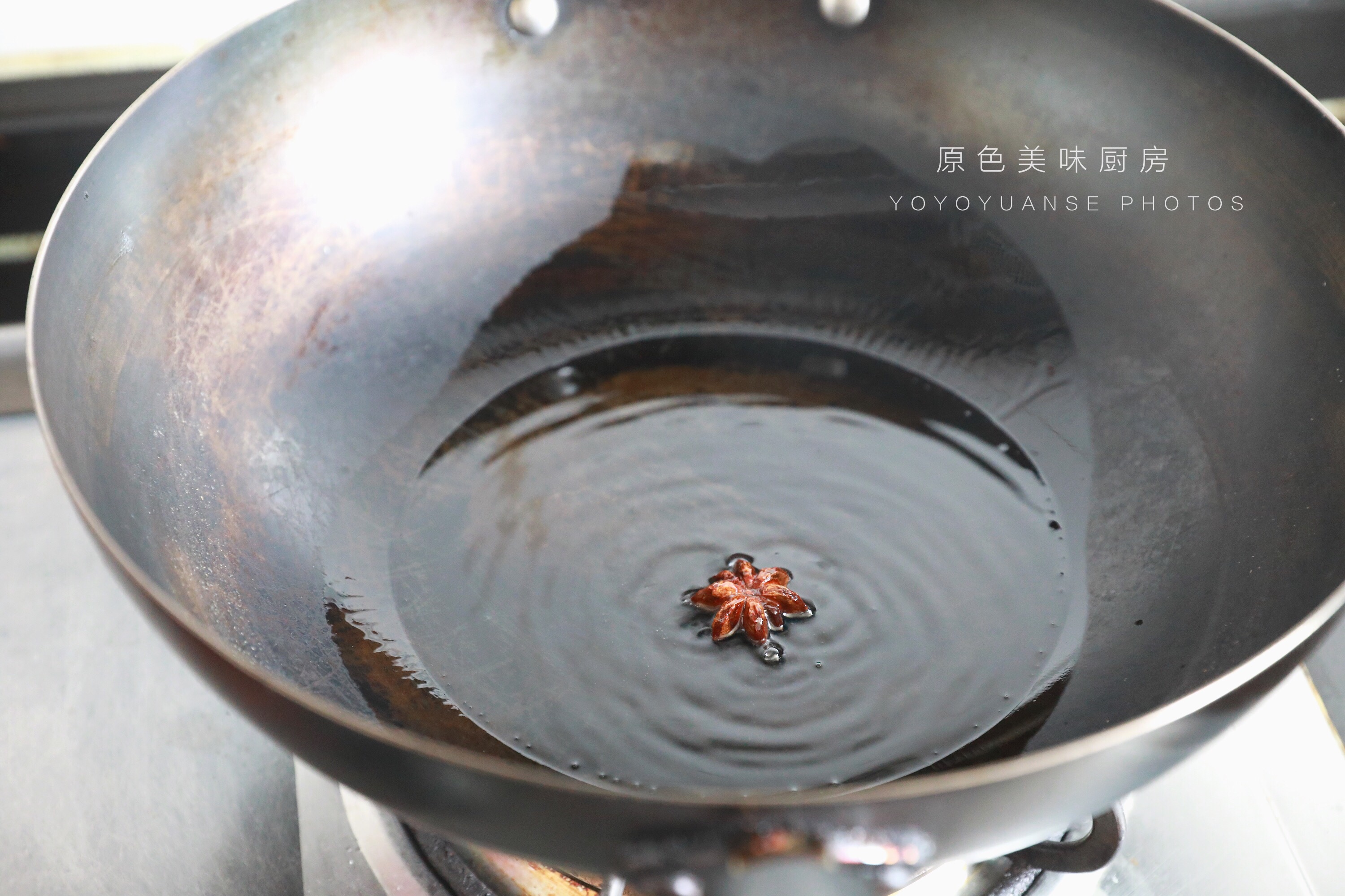 4.将锅内加入适量色拉油,加入八角,炒香。
