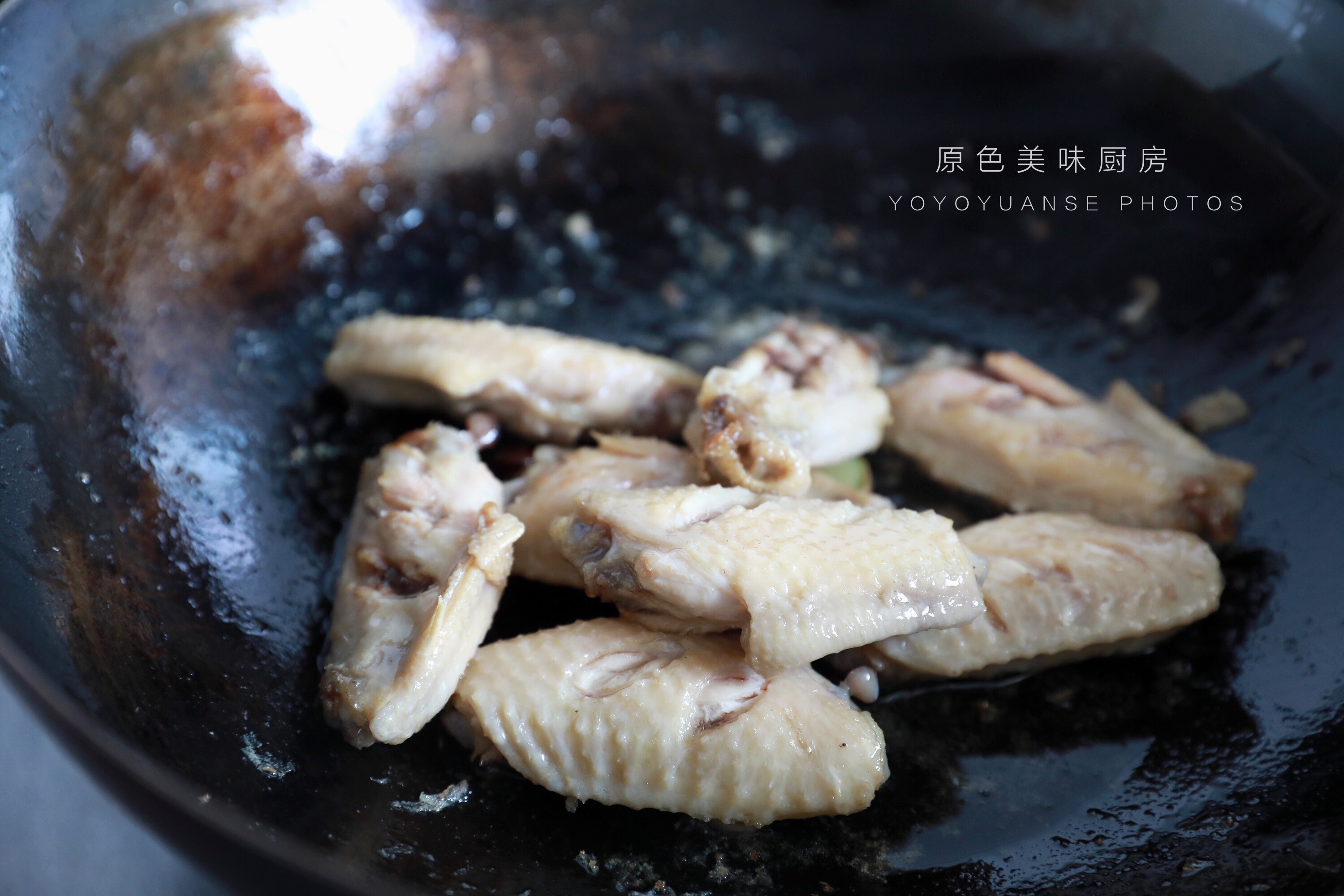 5.加入鸡翅,稍微煎一下。
