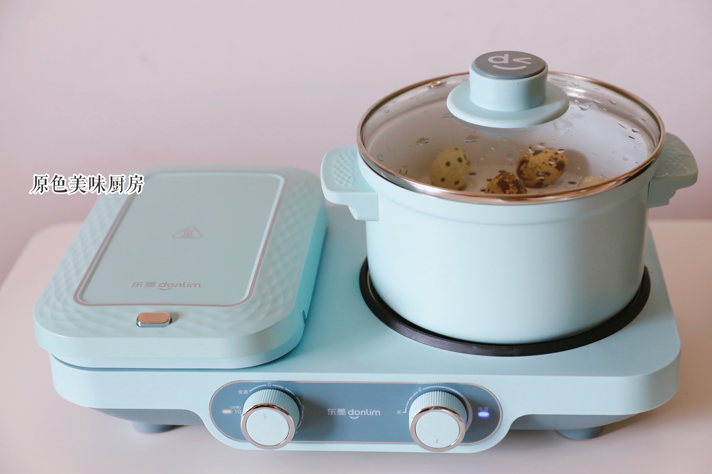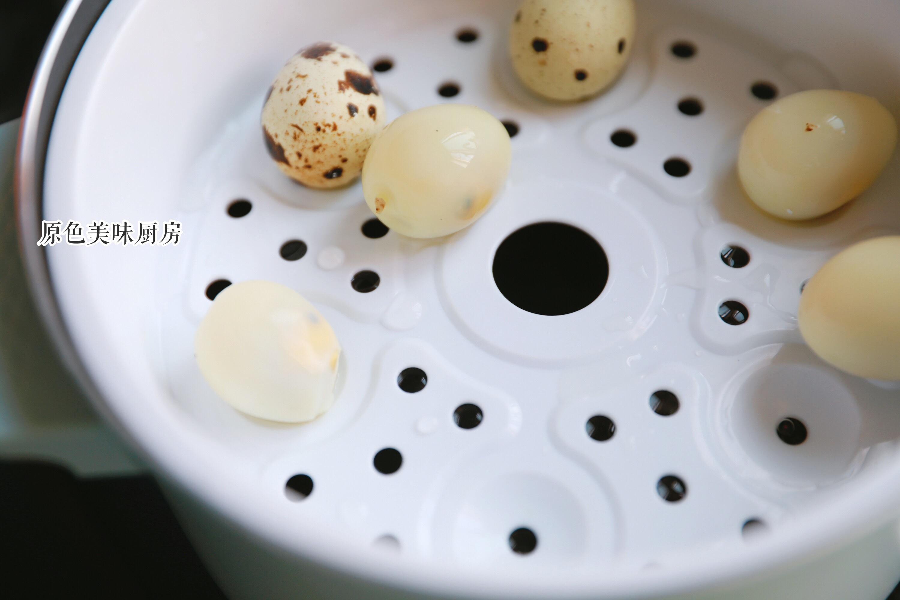 10.不粘锅内继续加入足量水,安装好蒸笼,放入清洗好的鹌鹑蛋,打开旋钮,定时6分钟,将鹌鹑蛋蒸熟。