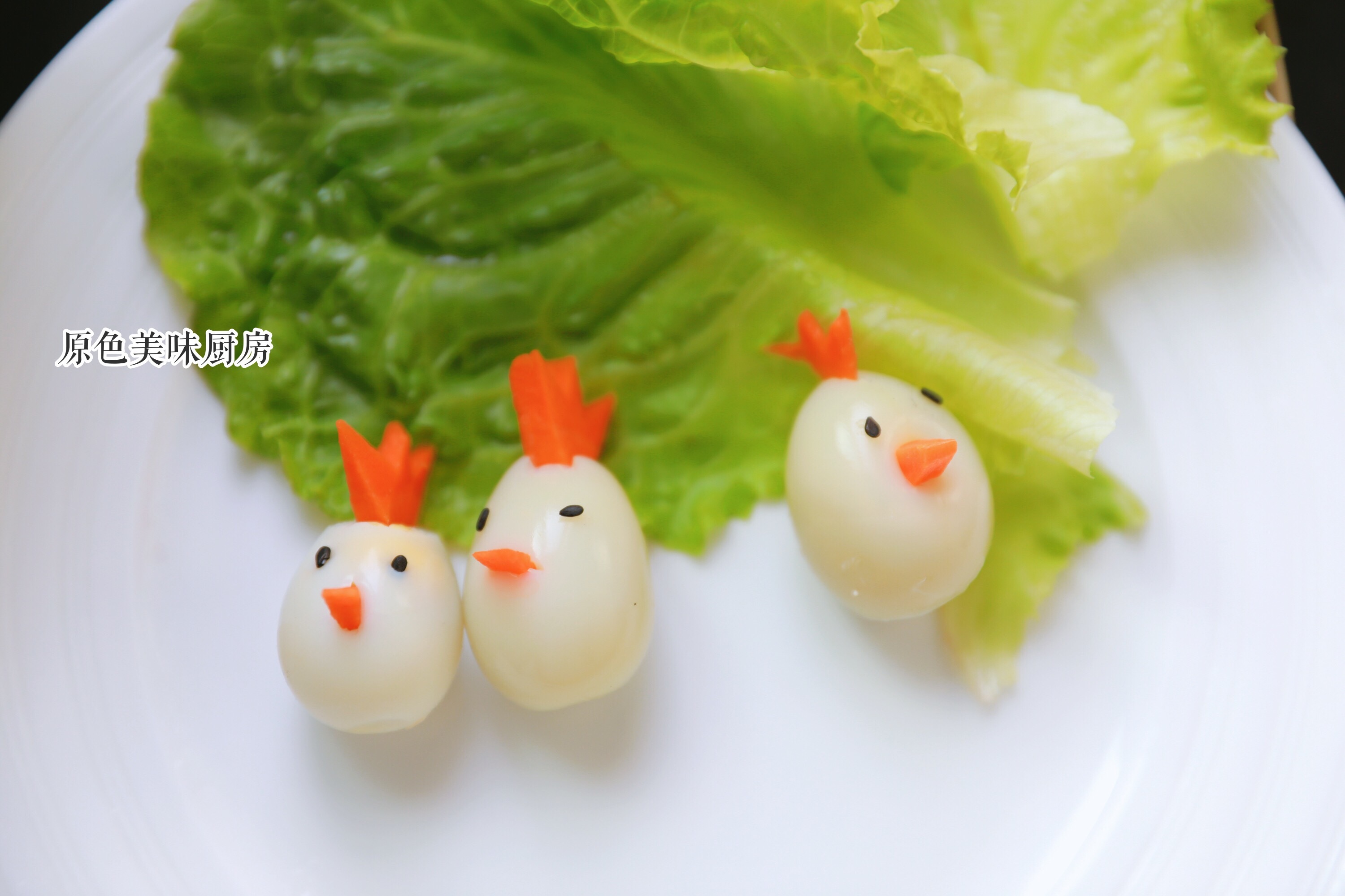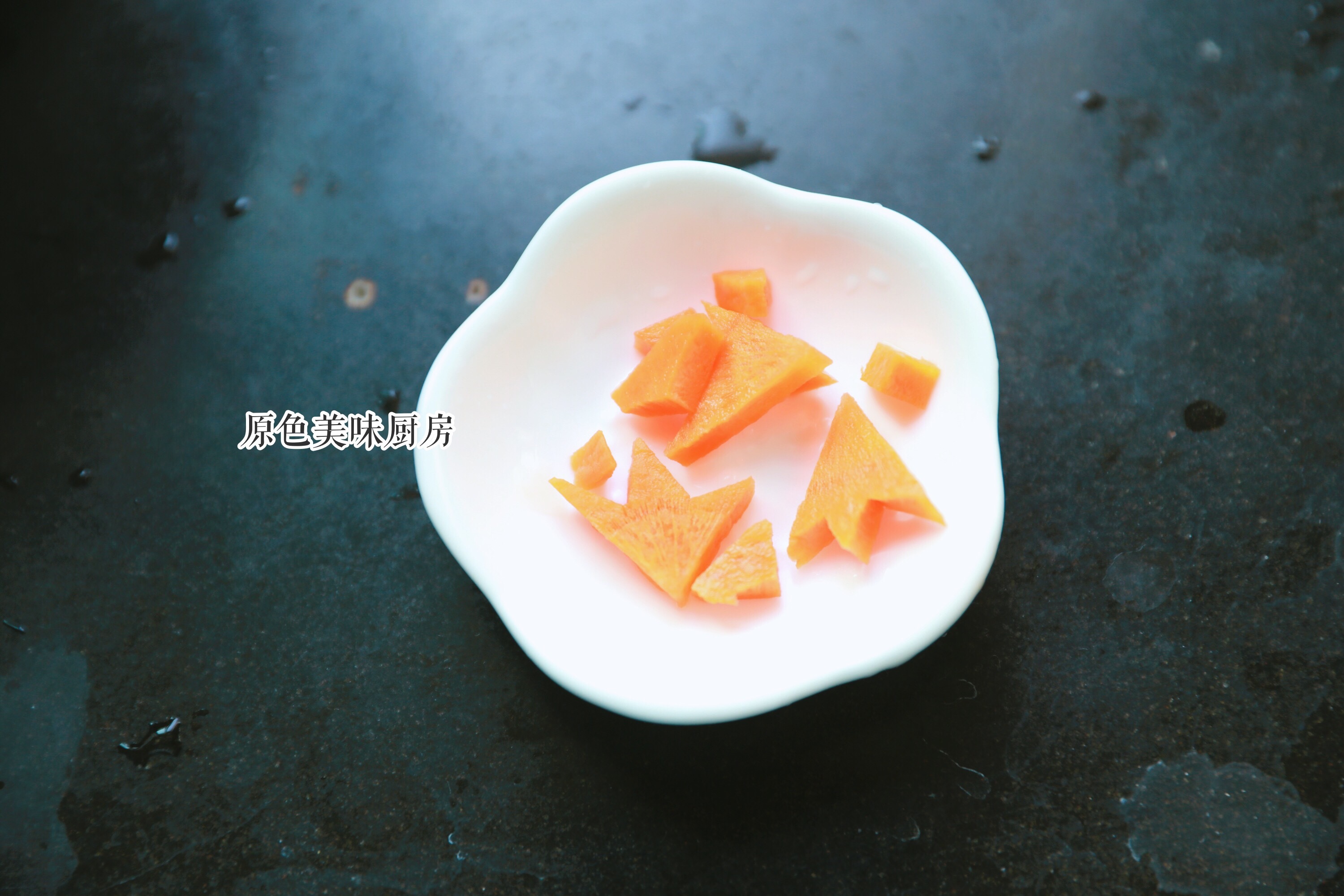 11.将胡萝卜切出图中的形状,做出小鸡的鸡冠和嘴巴。