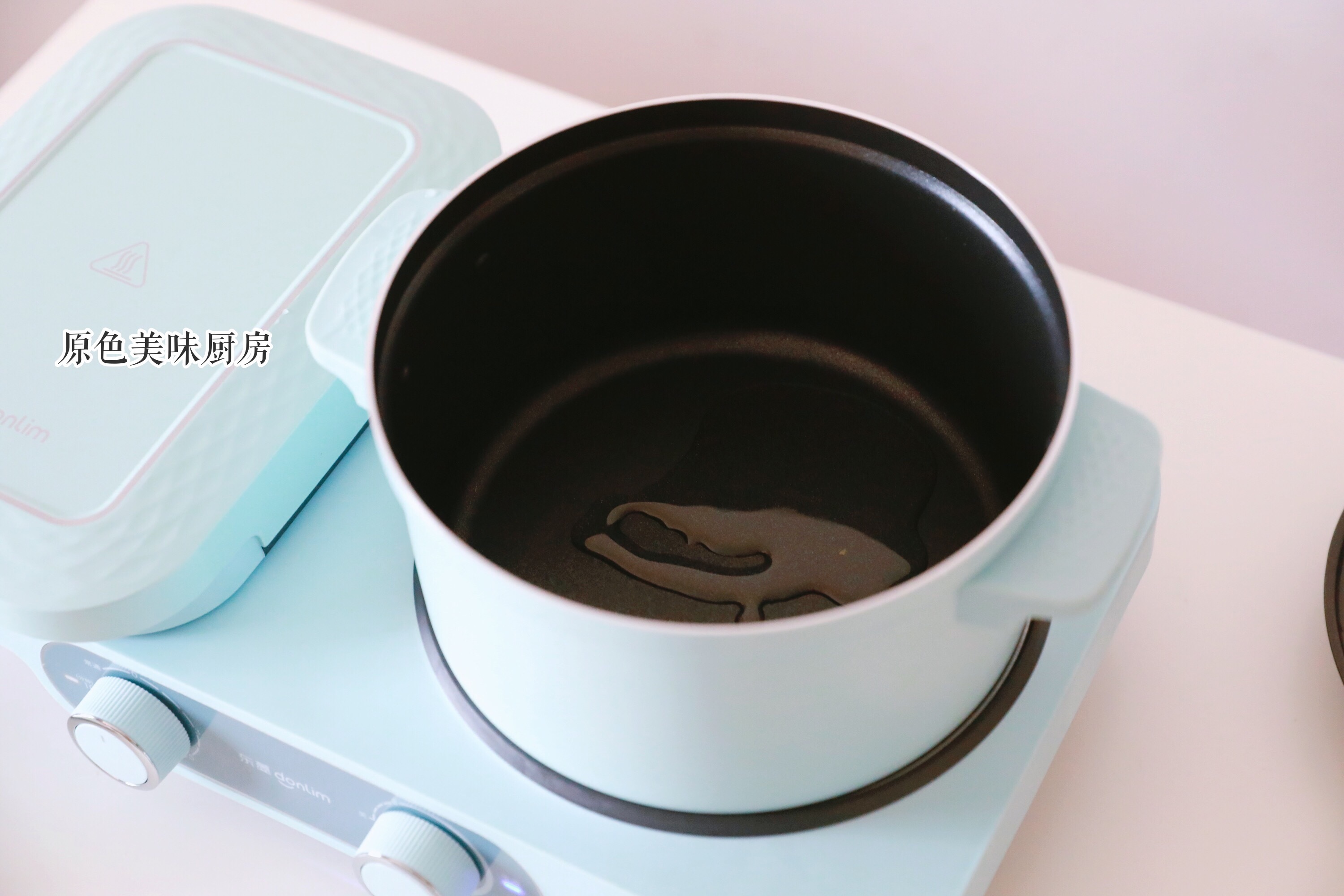 4.将三明治早餐机的不粘汤锅内加入适量色拉油,旋转按钮转到最大,烧热锅。
