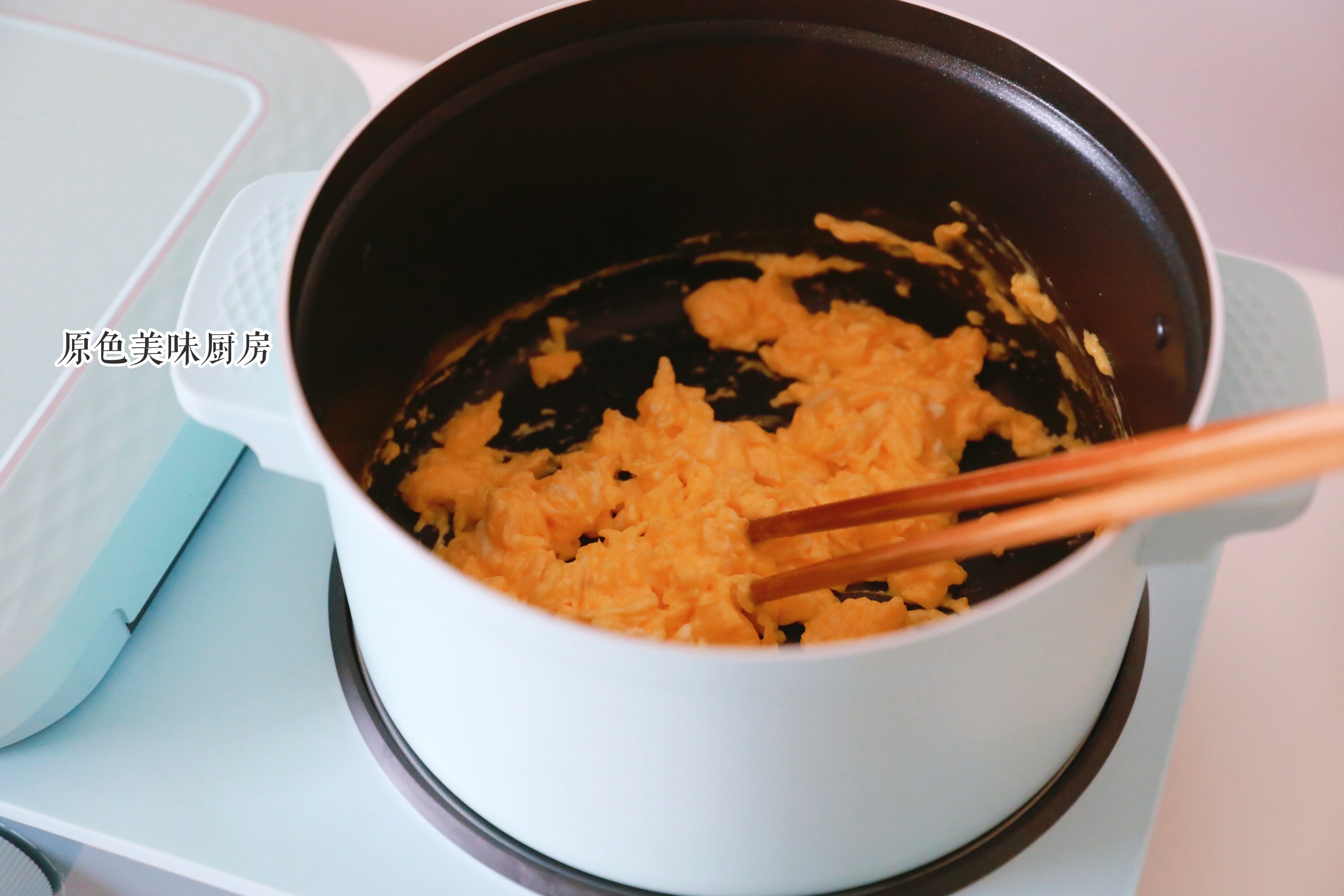 5.加入鸡蛋液,用筷子划散,鸡蛋不要炒太老,继续加入色拉油,翻炒均匀。