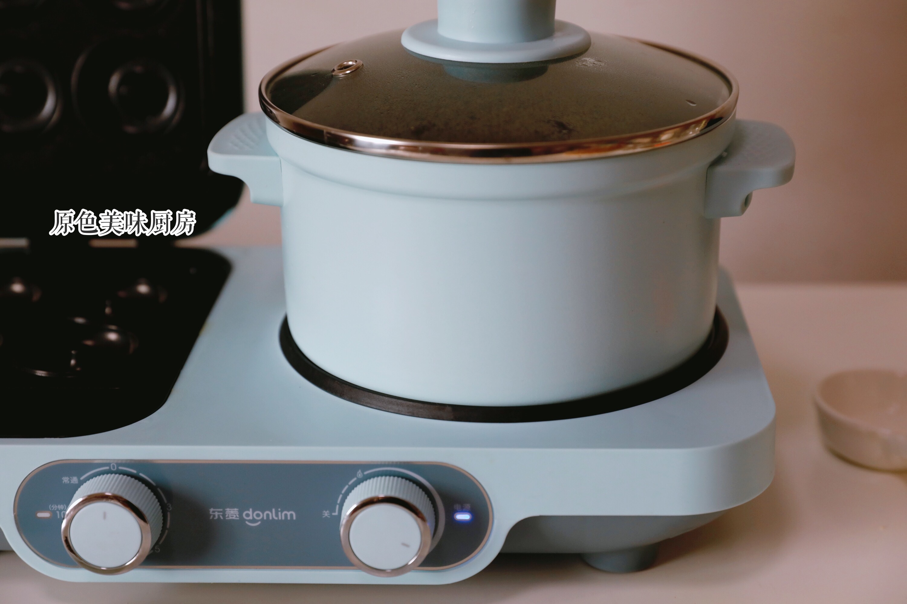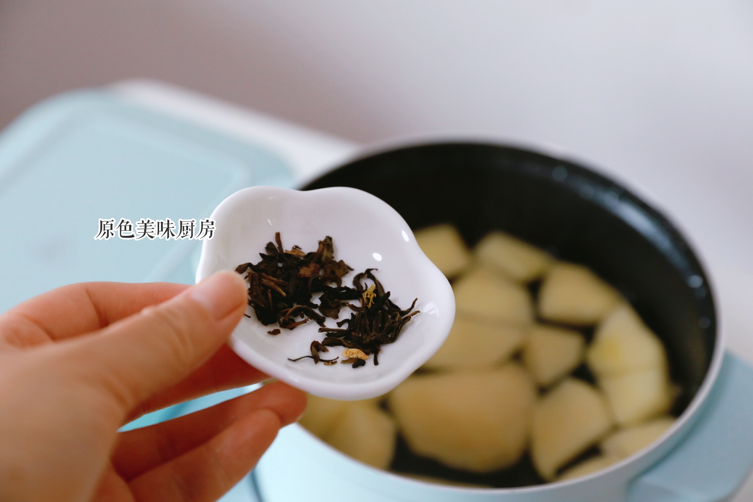5.关闭机器,加入茉莉花茶,盖好锅盖焖一会,茶叶不要煮,防止产生涩味。