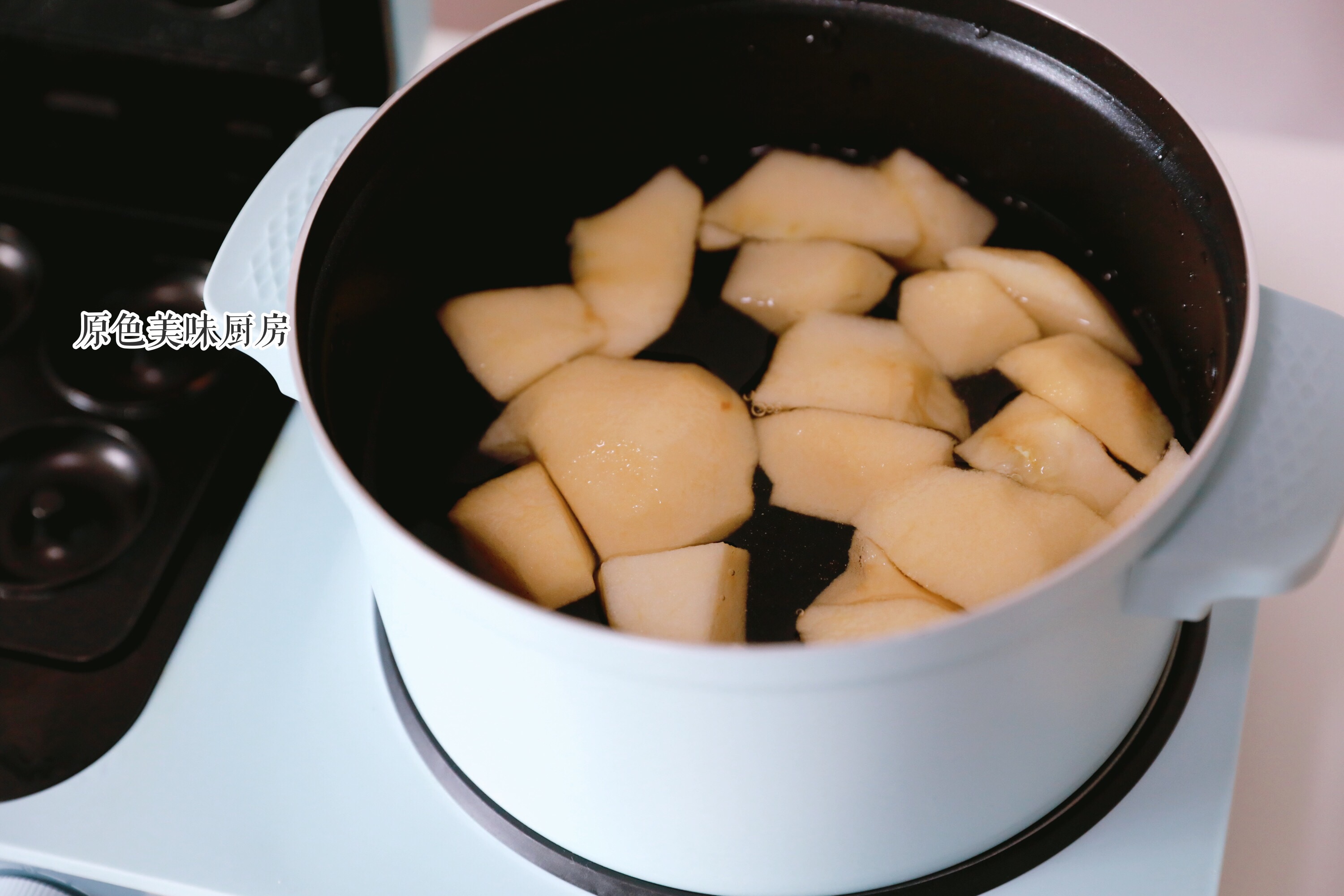 3.将水加入三明治机器的锅内,加入苹果块。