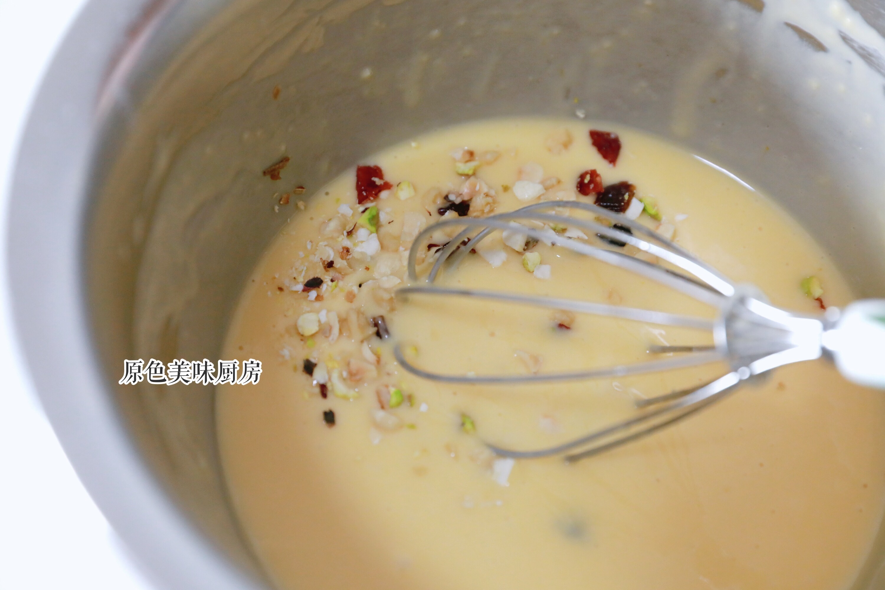 7.将坚果加入面糊内,拌均匀,静止10分钟。