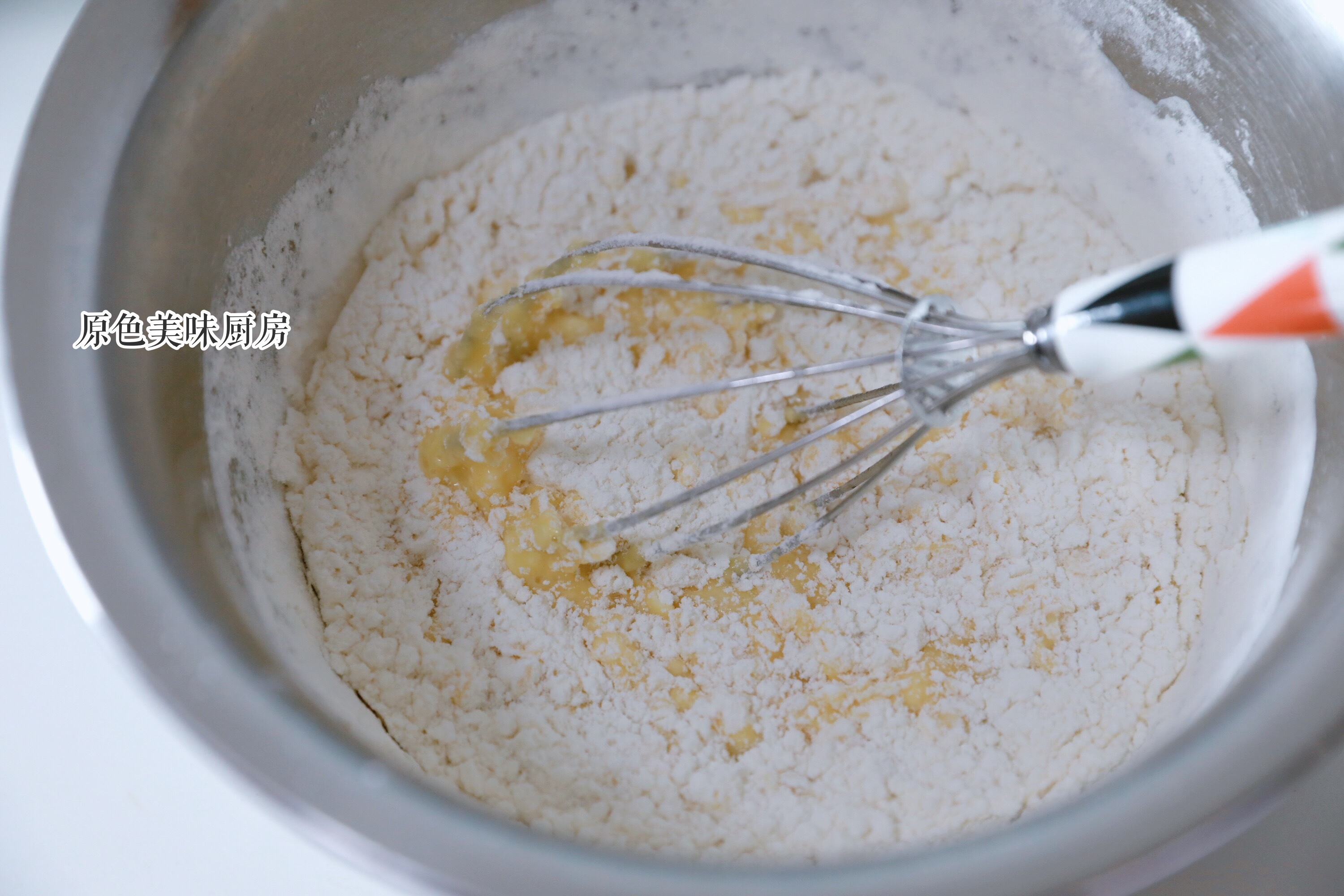 5.加入过筛的低粉,泡打粉搅拌至没有颗粒。