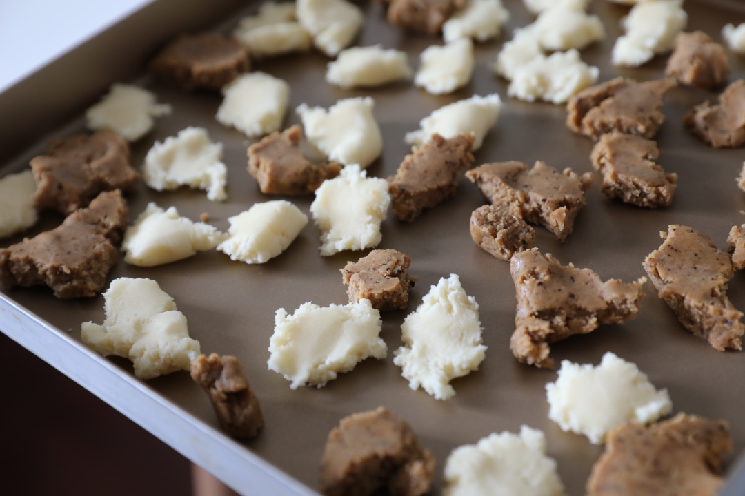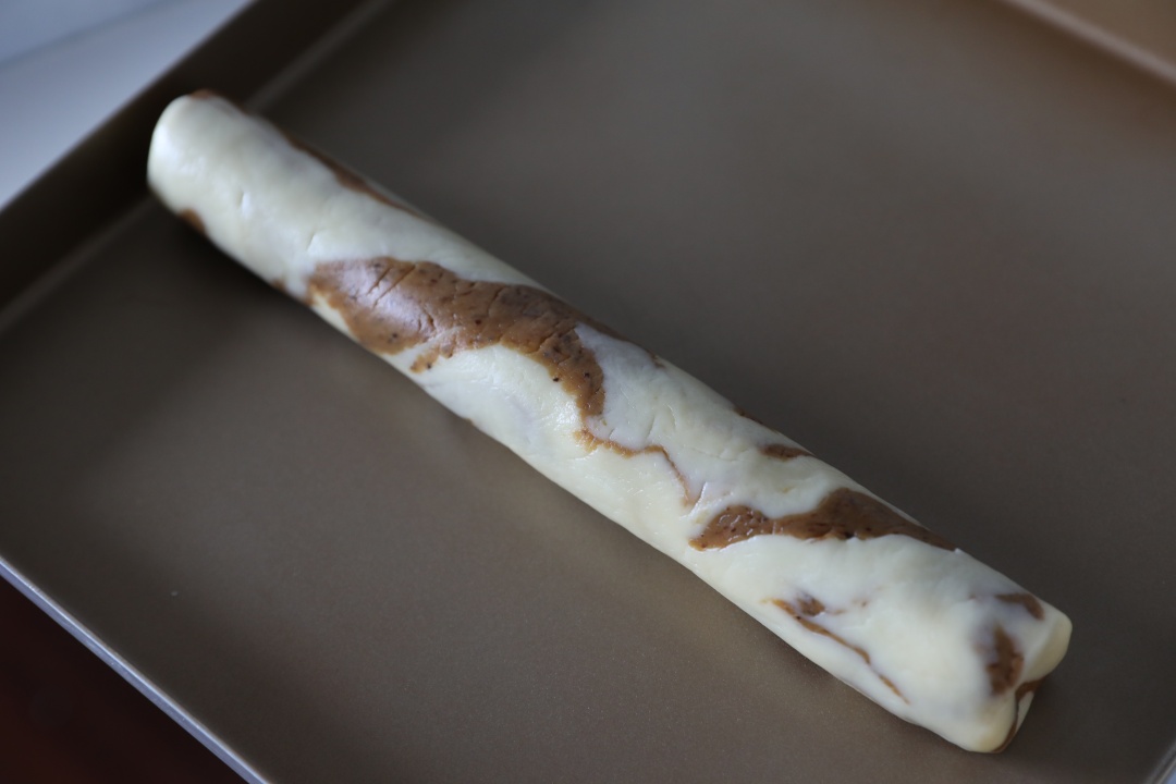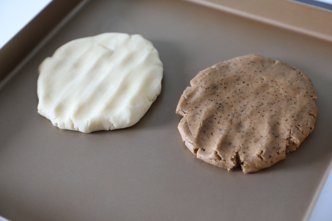 9.包上保鲜膜放入冰箱冷冻至变硬。冬天大约30分钟。将冻好的饼干面团拿出来,切成0.5毫米厚度的圆片。