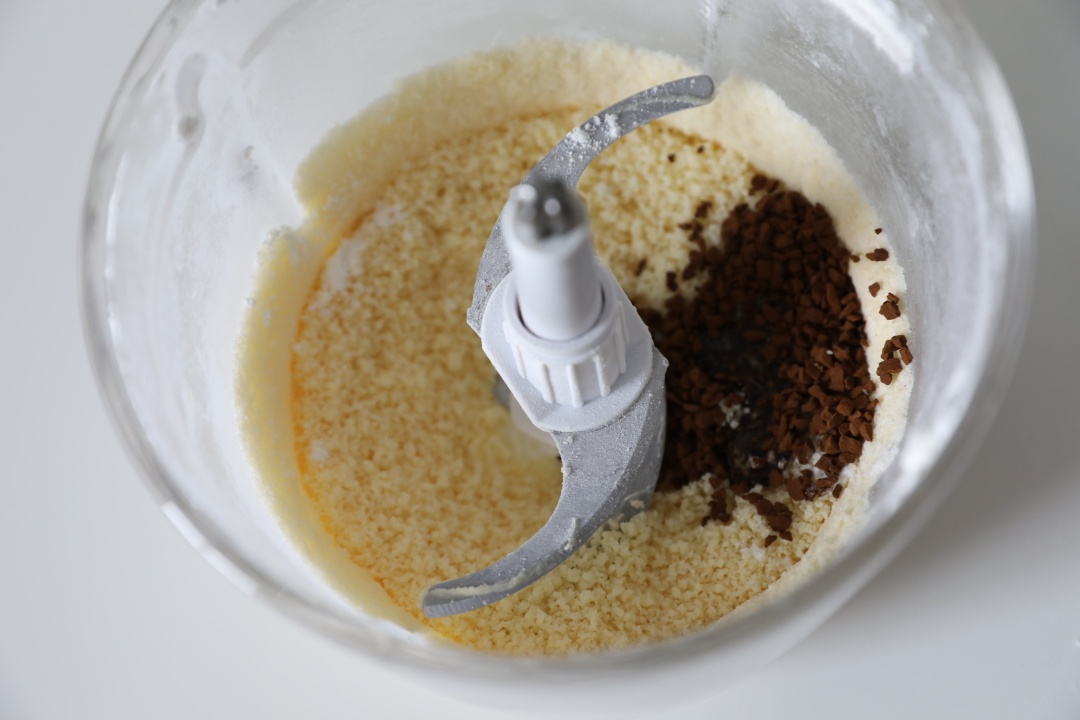 4.制作咖啡面团:第一步与原色面团一样,接着加入咖啡粉一起搅拌。
