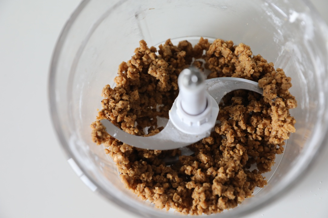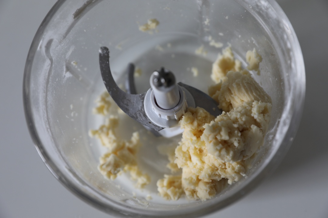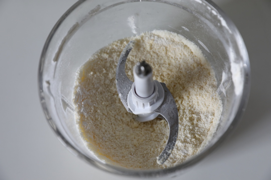 2.先制作原色的面团:将低粉,玉米淀粉,黄油,糖粉加入料理机内,搅拌成颗粒状态。