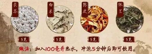 方法:取茯苓5克,白术5克,陈皮5克,佩兰5克,加入100毫升热水,冲泡5分钟后即可饮用。