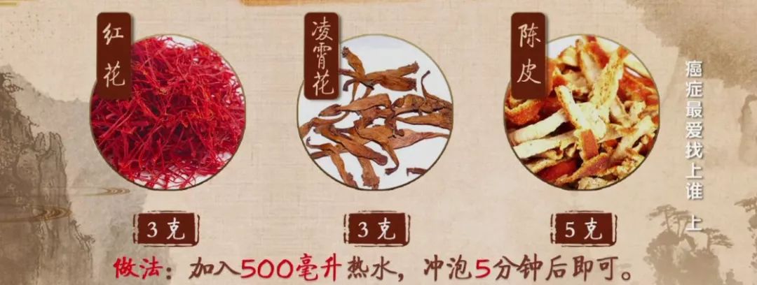 做法:红花3克、凌霄花3克、陈皮5克,加入500毫升热水,冲泡5分钟后即可。