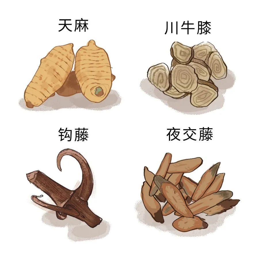 方歌:天麻钩藤石决明,杜仲牛膝桑寄生,栀子黄芩益母草,茯神夜交安神宁