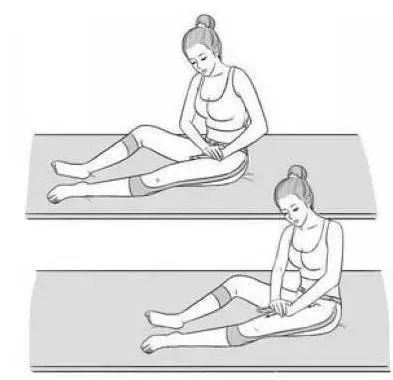 坐在床上,右腿向前伸直,左腿弯曲平放,双手交叠,压在大腿根部,沿着大腿内侧肝经的位置,稍用力向前推到膝关节,反复推动,四五十遍,然后换另一只腿同样的手法。
