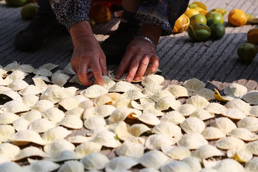 洗净的桔子晾干水份,剥下桔子皮,白色向上,放在通风有阳光地方完全晒干。