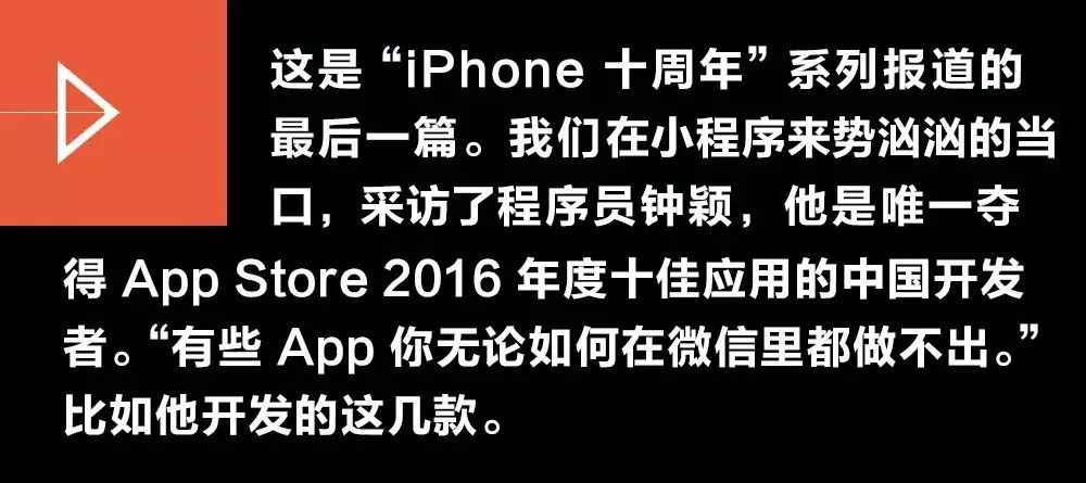 如今微信小程序来势汹汹,钟颖则说“小程序不能满足我的需求,它们大都适用于提供服务,但场景还是比较局限。”他在知乎上表示:“有些 App 你无论如何在微信里都做不出。”比如他开发的这几款。
