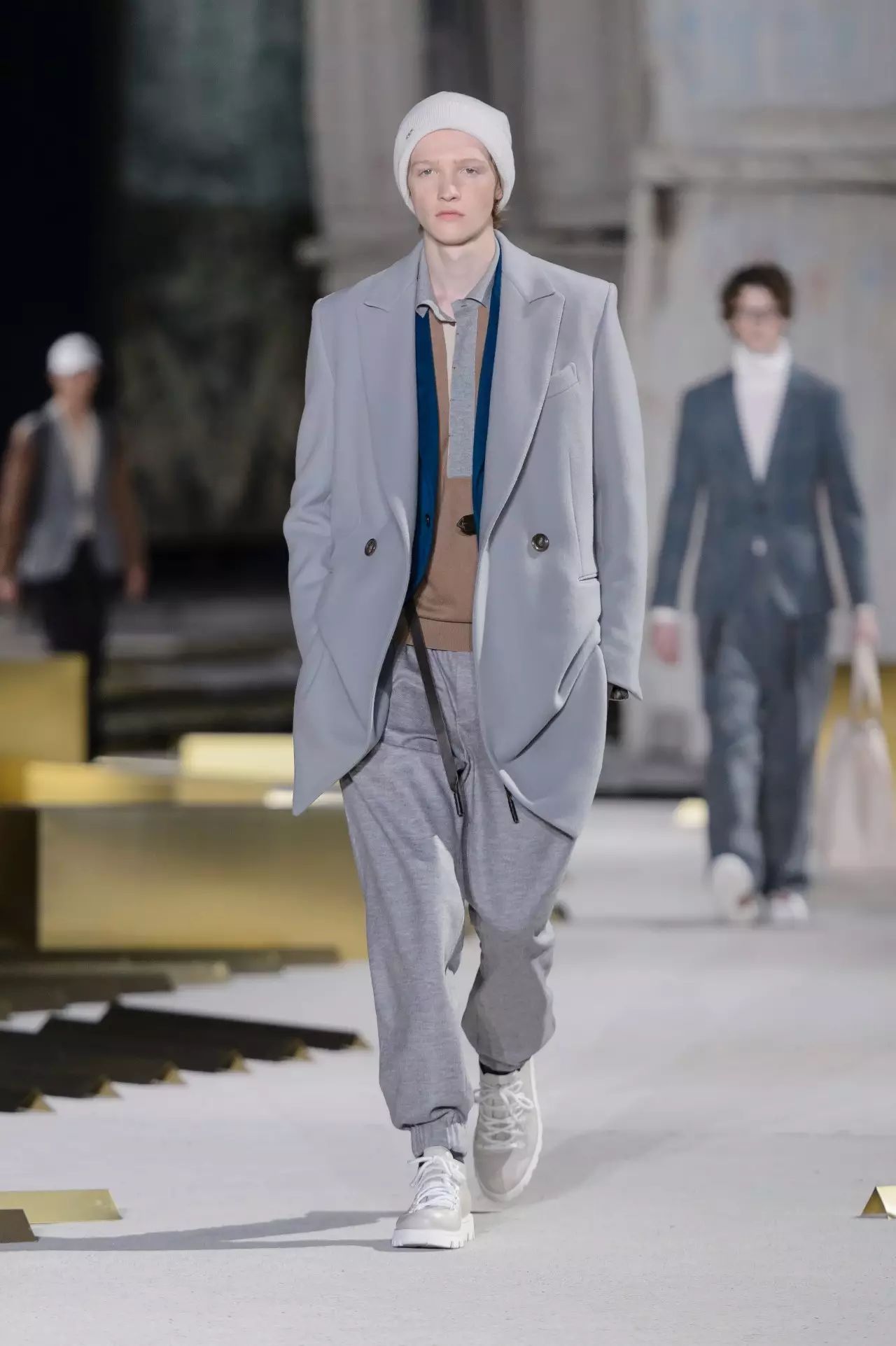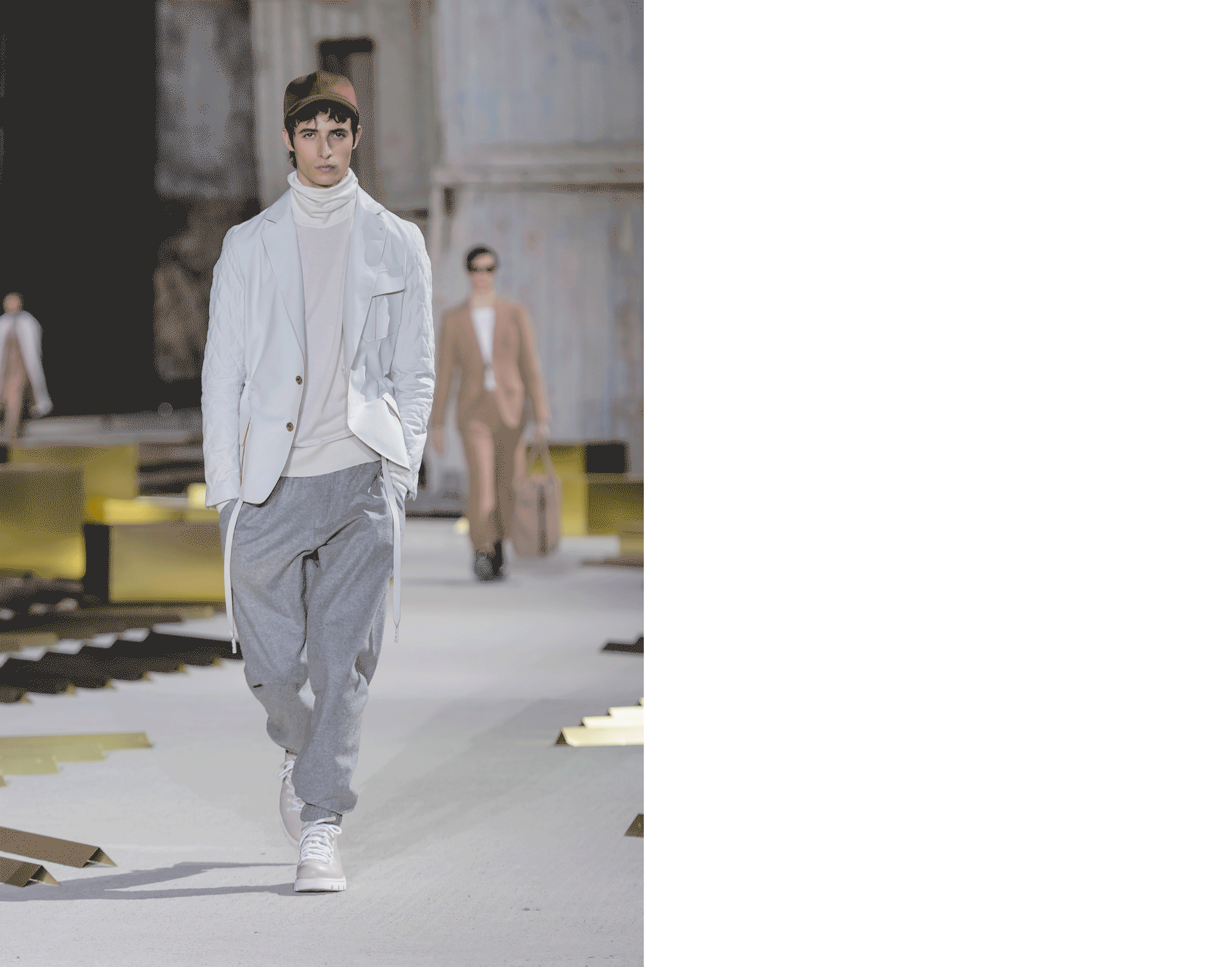 在开场的造型中,一件轻薄的白色西装、灰色羊绒毡运动裤、白色高领针织衫和一顶褚红色的棒球帽(Sartori