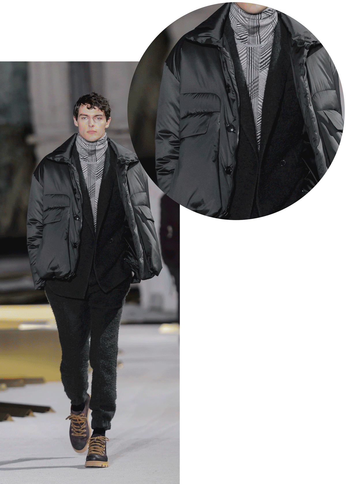 而这个系列真正的精髓还在于面料的研发。在之后出场的造型中,我们可以看到这些新开发的材质不仅改变了时装的质感,还让赋予了它们更高的功能性。